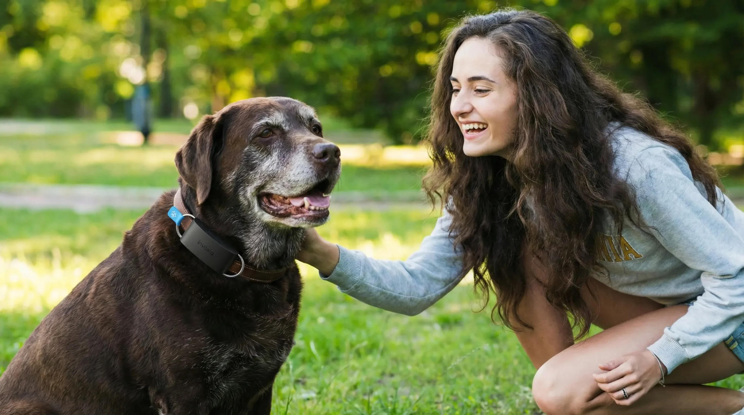 A coleira inteligente é utilizada para monitorar a saúde e o comportamento do cão em tempo real.
