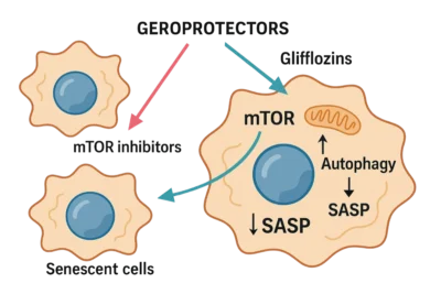 Pesquisas de ponta mostram que substâncias como a rapamicina (inibidor de mTOR), as gliflozinas (inibidores de SGLT2) e os senolíticos podem atuar em mecanismos fundamentais do envelhecimento.